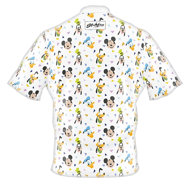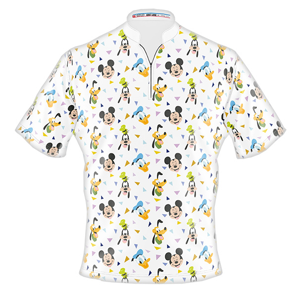 This high-tech Disney jersey is durable and made from moisture-wicking fabric. It has a sash collar with a 3/4 zip front. The colorful design is dye-sublimated. The jersey is washable in cold water. For best results, not use bleach or fabric softener, air dry. Do not use abrasives to clean the shirt, as they may snag the fabric. The jersey is proudly made in the USA. See chart below for sizing information.