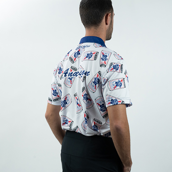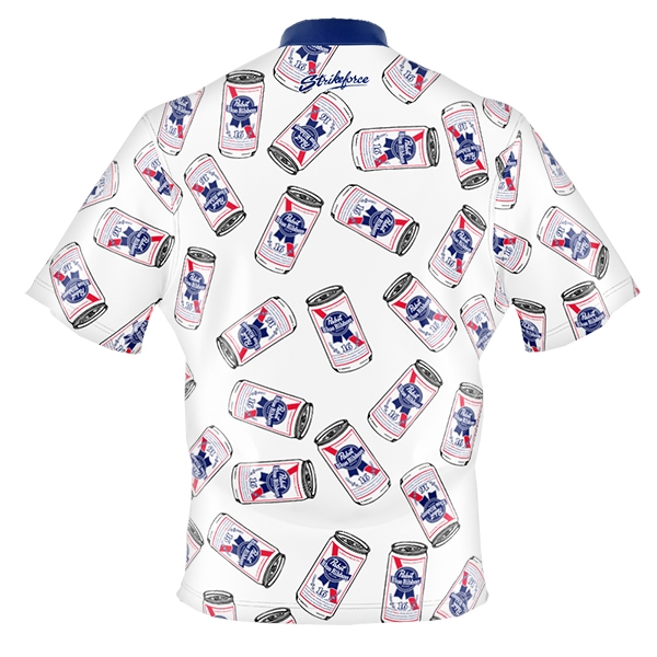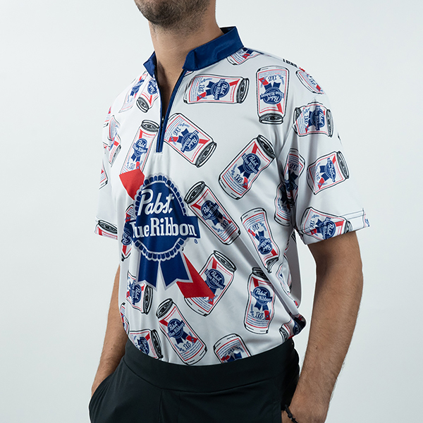 This high-tech Pabst Blue Ribbon jersey is durable and made from moisture-wicking fabric. It has a sash collar with a 3/4 zip front. The colorful design is dye-sublimated. The jersey is washable in cold water. For best results, not use bleach or fabric softener, air dry. Do not use abrasives to clean the shirt, as they may snag the fabric. The jersey is proudly made in the USA.