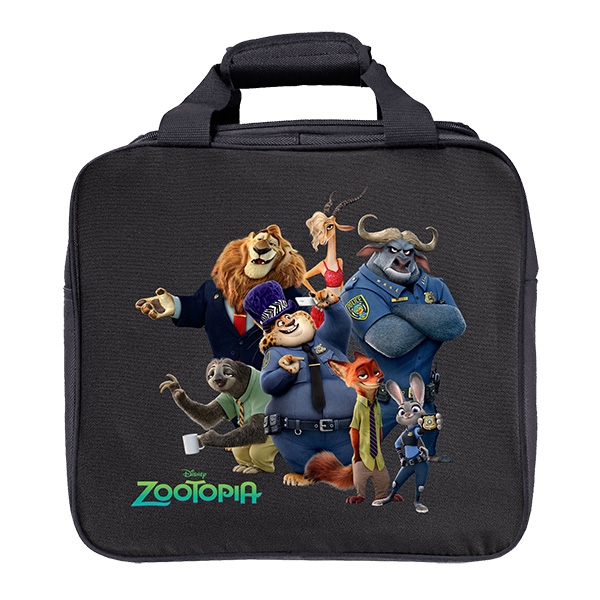 Disney movie Zootopia cast of characters, including Nick WIlde and Judy Hopps, are featured on this 1-ball tote bag.