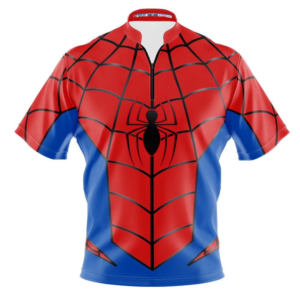This high-tech Marvel jersey is durable and made from moisture-wicking fabric. It has a sash collar with a 3/4 zip front. The colorful design is dye-sublimated. The jersey is washable in cold water. For best results, not use bleach or fabric softener, air dry. Do not use abrasives to clean the shirt, as they may snag the fabric. The jersey is proudly made in the USA. See chart below for sizing information.